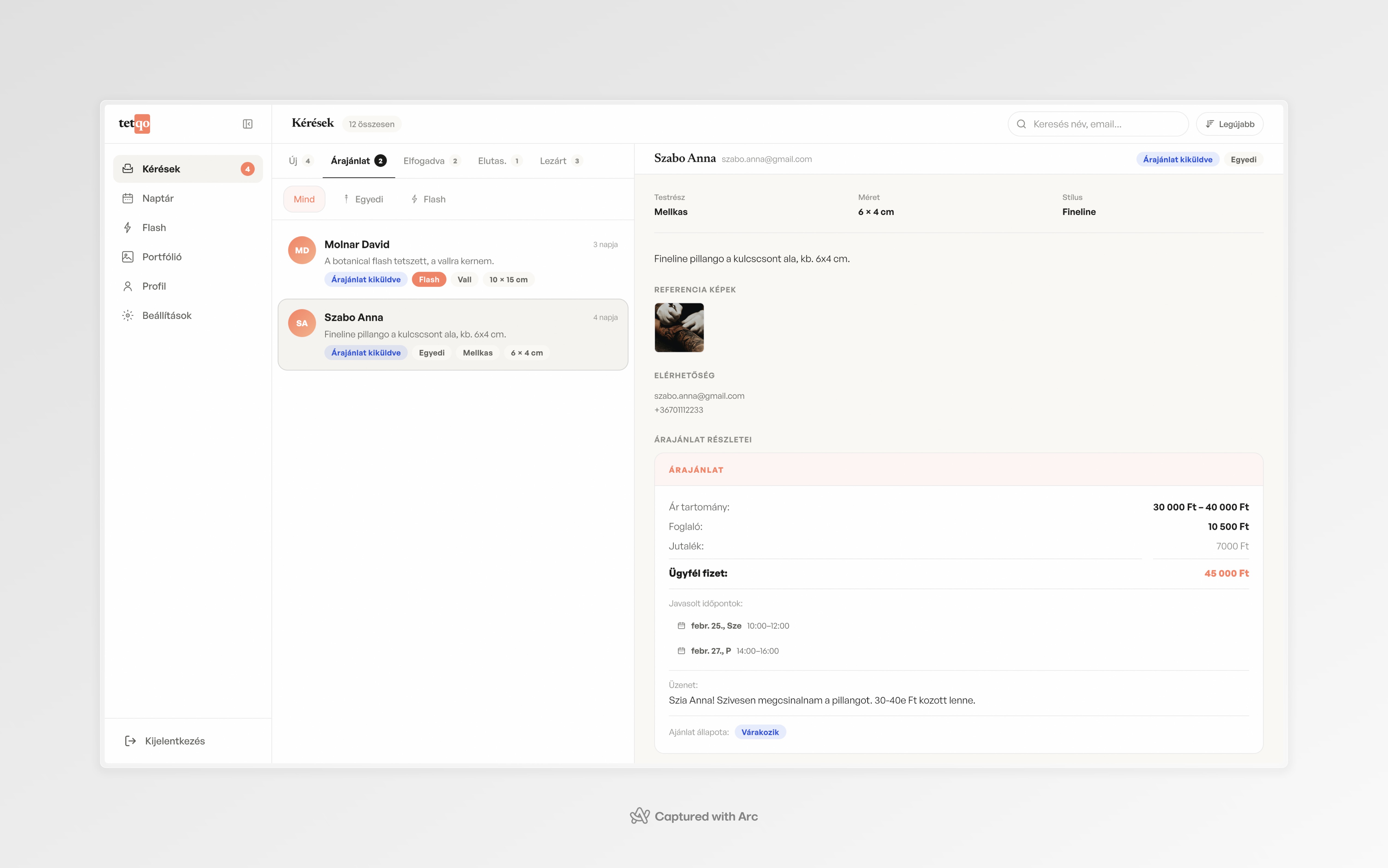Az ügyfél kitölti a foglalási űrlapot: méret, testrész, referencia képek. Te megkapod az összeset, rendezetten, egy helyen. Nincs több „szia, mennyibe kerülne egy kis tetkó?”