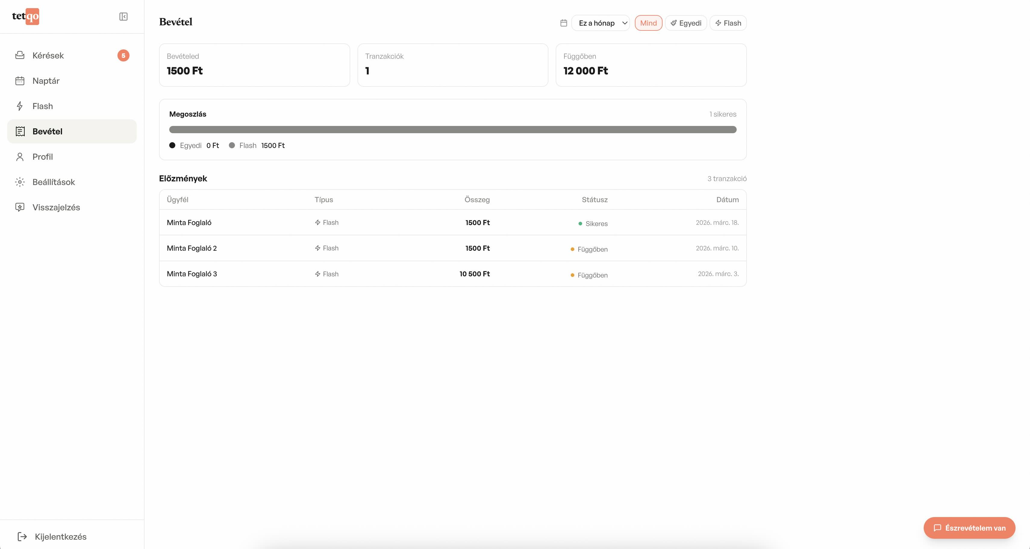 A tetqo dashboardján átlátható összesítőt látsz az összes beérkezett fizetésedről, foglalóról és kifizetésről. Havi bontásban követheted a bevételeidet, így mindig tisztán látod a pénzügyeidet.